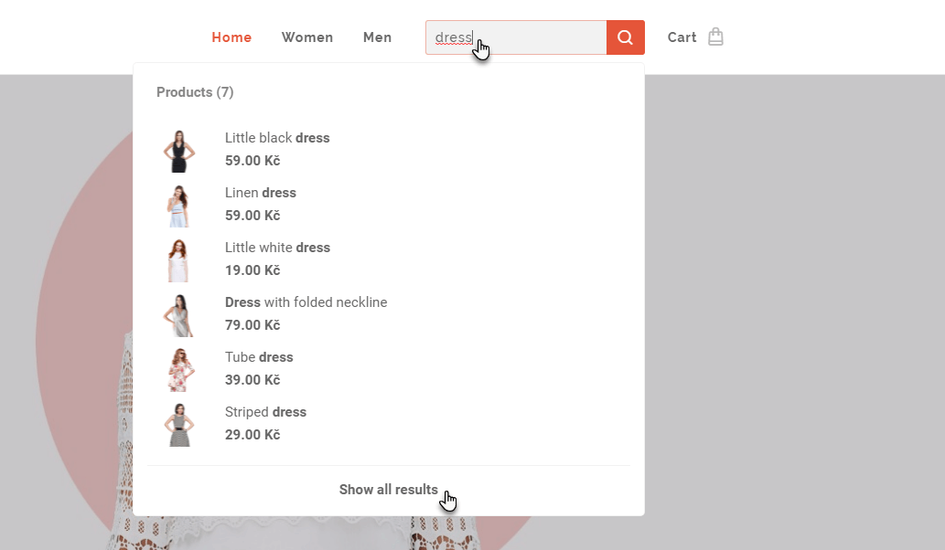 In this guide, you will learn how to add a product search field to your e-shop. This feature is only available in our Pro and Business packages. The function is available only if the e-shop module is activated on the project and is only used to search for products, ie not the general content of the pages.