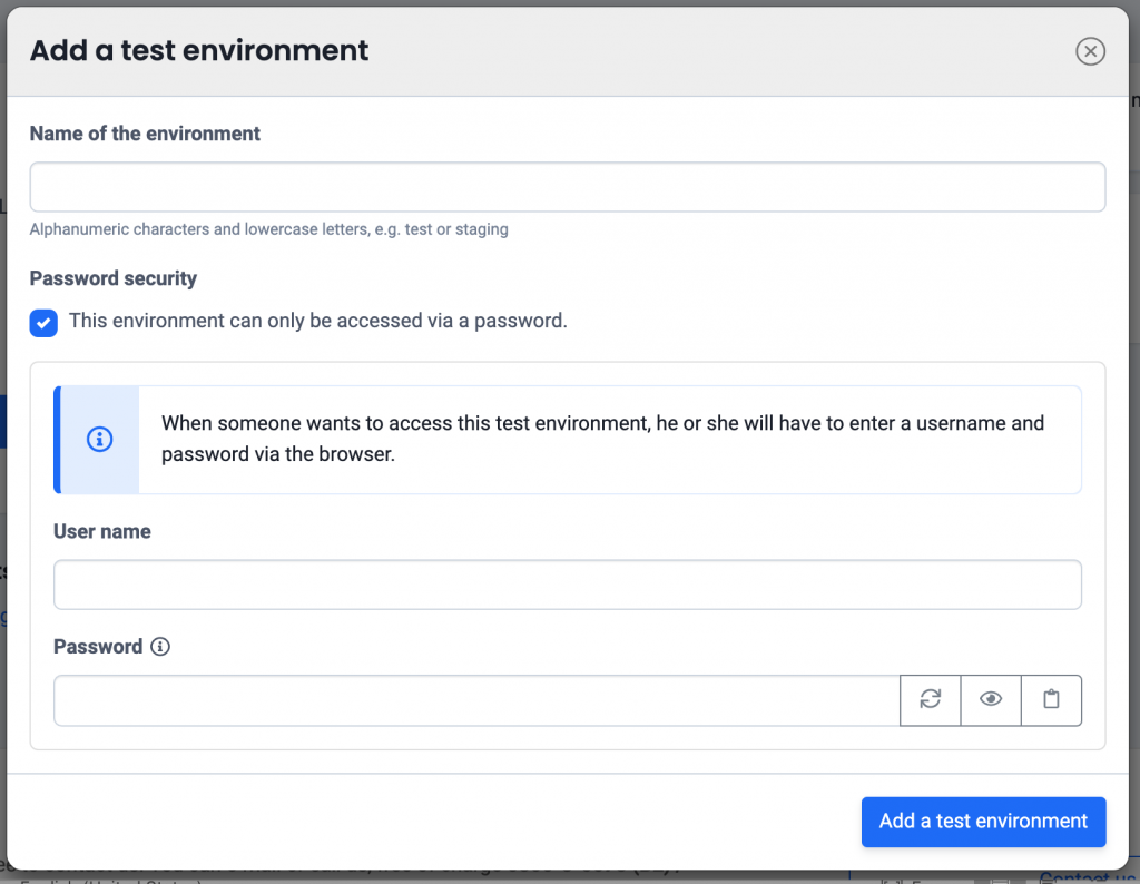 - A pop-up window will appear. Here, you need to give your test environment a name and optionally, a username and a password to prevent others from visiting your test website. Click on “Add a test environment” to finalize. This will take a moment.