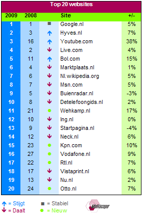 Les sites de commerce en ligne tels que bol.com, Wehkamp et Neckermann accueillent clairement plus de visiteurs qu’avant. Presque la moitié du Top 20 des sites web néerlandais font du commerce en ligne. Les sites web de contenu tels que startpagina et nu.nl sont par contre quelque peu mis sous pression et perdent leurs positions en raison de l’essor des sites web communautaires tels que Facebook et Hyves.nl.