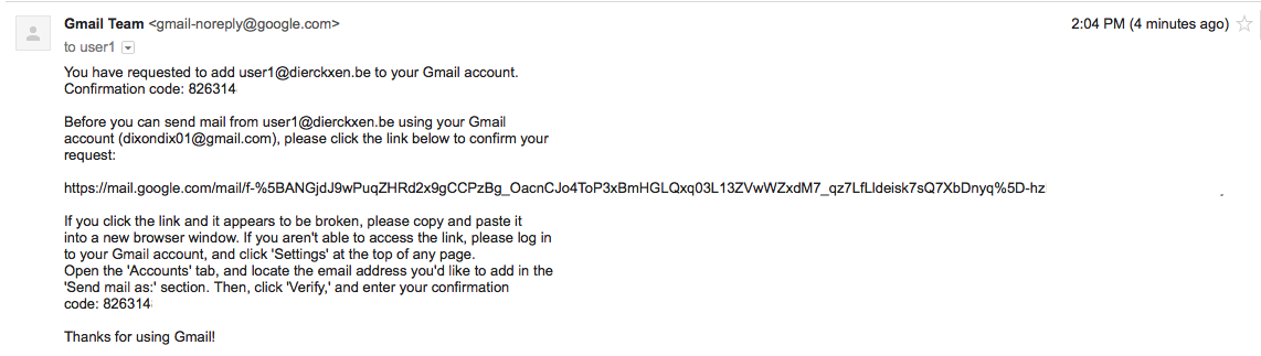 - Si vous choisissez de saisir le code de vérification, votre boîte mail sera ajoutée sur-le-champ. Si vous choisissez de cliquer sur le lien, un nouvel onglet s’affiche et vous devez cliquer sur le bouton « Confirm » pour pouvoir poursuivre.